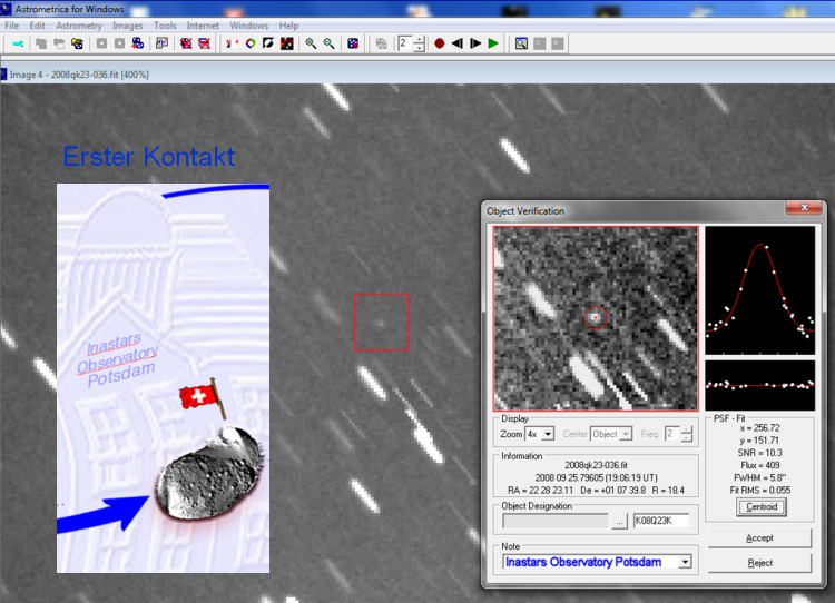 Chronologie: Eine Schlechtwetterperiode im Spätsommer 2008 machte es dem Planetensucher Markus Griesser schwer an seinem gerade erst entdeckten Kleinplaneten 2008 QK23 dran zu bleiben. Dem Hilferuf des Schweizer Kollegen und Leiter der Eschenberg Sternwarte (151) in Winterthur folgte ich gern und konnte so einige follow-up's vom Potsdamer Standort (B15) beisteuern. In den nächsten 7 Jahren wurde der Orbit des Asteroiden durch mehrere internationale, um die gesamte Erde verteilte Observatorien weiter vermessen und präzisiert. Von kleinen 36cm Teleskopen bis Spiegeln der 2m Klasse war hier recht unterschiedliches Equipment in der Zusammenarbeit vereint. Am 9. September 2014 wurde der Asteroid 2008 QK23 durch das Minor Planet Center nummeriert (367406). Er ist jetzt das 367406-te Objekt in unserem Sonnensystem und dem Entdecker seht es nun zu, einen offiziellen Namensvorschlag bei der Internationalen Astronomischen Union (IAU) einzureichen. |