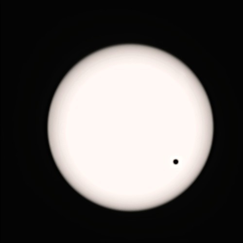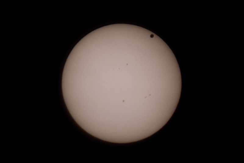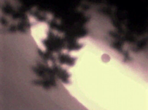 Am Morgen des 8. Juni wanderte Venus vor der Sonnenscheibe entlang. Der scheinbare Durchmesser betrug 58".6, was ca. 3% der Sonnenscheibe entspricht.  Die Aufnahme entstand auf einem Parkplatz 30km vor Paris, mit einer handelsüblichen Videokamera auf einem Stativ, ohne Nachführung, mit Sonnenfilterfolie vor dem Zoomobjektiv.